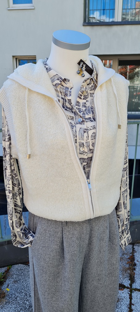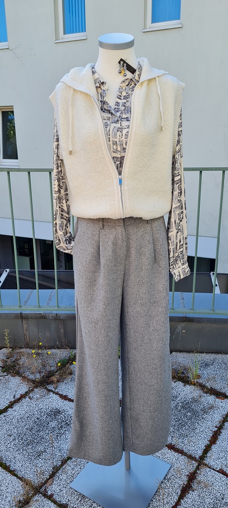 Look des Tages – in dieser Woche neu eingetroffen: Sehen Sie die edle Viskosebluse in Grau-Cremetönen zur grauen Hose aus einer Wollmischung (bis zum Knie gefüttert). Dazu gibt es die kleine Teddy-Weste mit Kapuze. Das nennt man sportlich-elegant :-). Silberne Ohrringe von Konplott runden den Look ab.