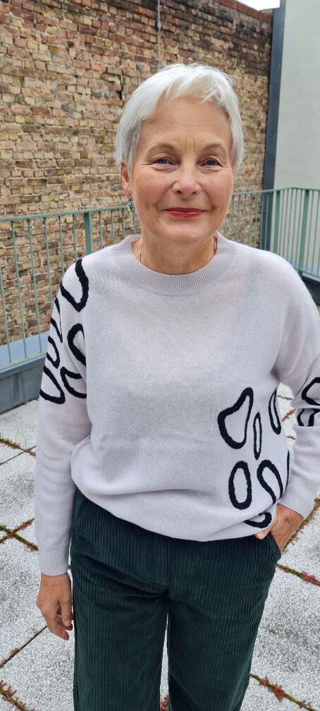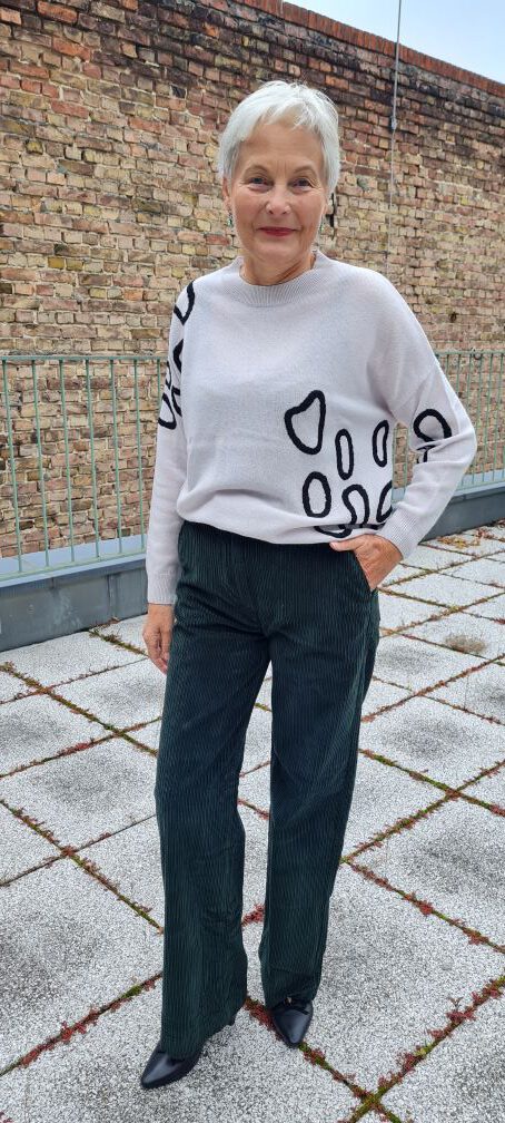 Look des Tages mit unserem leichten, zugleich durch den hohen Kaschmir-Anteil mollig wärmenden Pullover von dem deutschen Label Faber. In Deutschland gestrickt! Er ist besonders hochwertig und durch die aufgestickten Ornamente ausdrucksstark gemacht. Hier sehen Sie ihn zur tiefgrünen Cordhose mit Bundfalten aus Spanien. Dazu gibt es Ohrringe von Konplott.