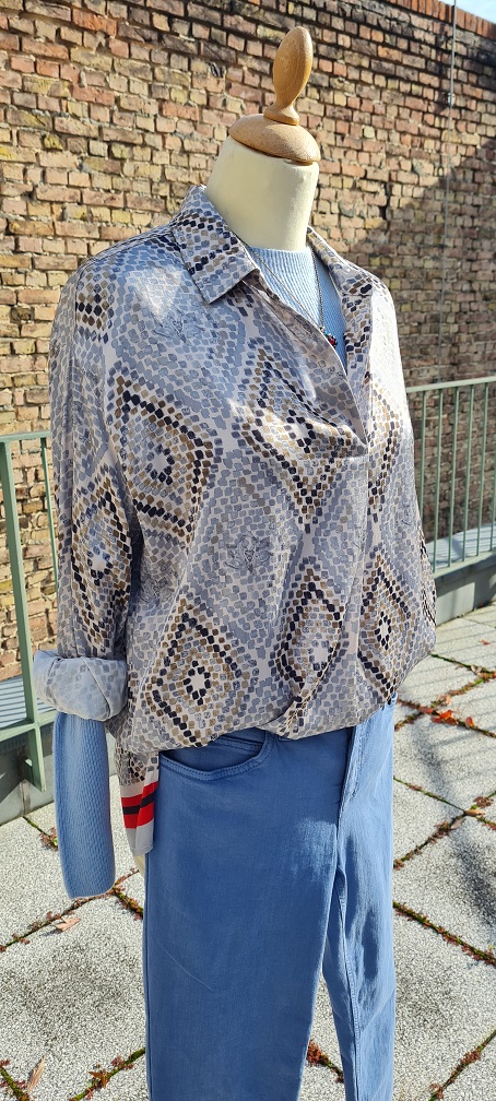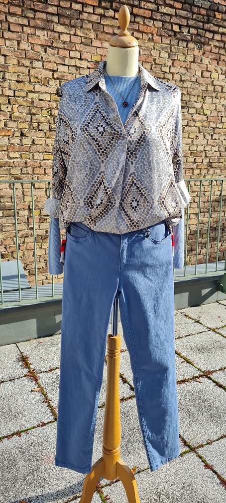 Look des Tages: Eine klassisch geschnittene Bluse unter einen Pullover anziehen – das kennt jeder. Aber nur wenige drehen den Spieß um. Sehen Sie heute die seidig glänzende Bluse aus einem festen Viskosestoff über dem hellblauen Kaschmirpullover. Die Ärmel der Bluse sind weit hochgekrempelt und der Kragen geöffnet, damit beides gut zur Geltung kommt. Dazu kombinieren wir die schmale Stretchjeans von OUI und geben eine kleine Kette von Konplott dazu.