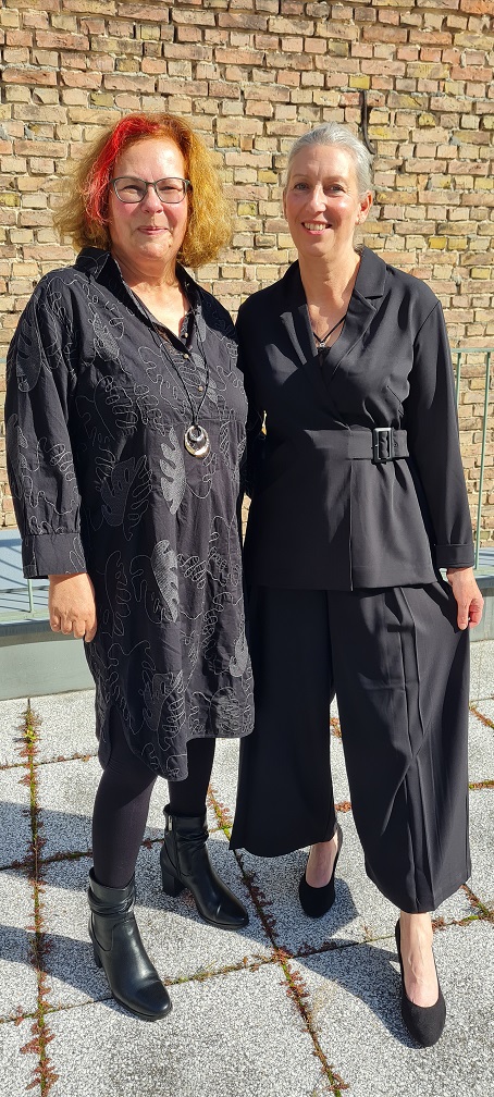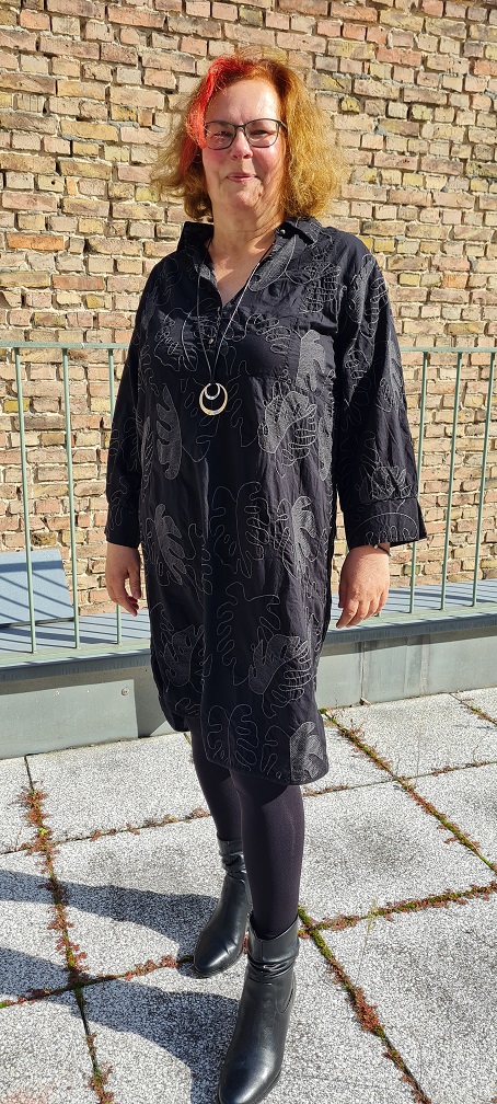Look des Tages mit der wunderschön bestickten Langtunika aus schwarzer Baumwolle, einfach mit blickdichten Leggins und Stiefeln als Kleid inszeniert. Für den Winter vielen sicher nicht warm genug – aber für heute: Super angenehm! Den schwarzen Anzug nebendran stellen wir in Kürze gesondert vor.