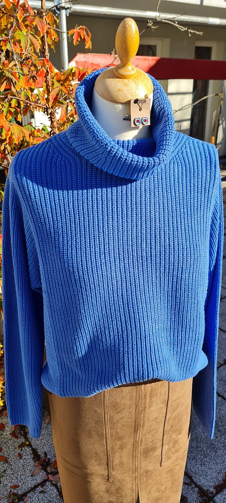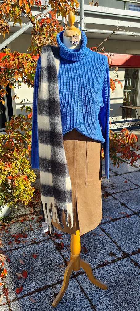 Look des Tages mit dem neu eingetroffenen Rollkragenpullover in einem strahlenden Blauton, aus 100% Baumwolle. Er kratzt damit garantiert nicht und ist von gewohnt hervorragender OUI-Qualität. Wir können uns darauf verlassen, dass er sich nicht verformt. Im Bild ist er zum schmalen, langen Velours-Rock mit einem hohen Schlitz kombiniert. Dazu gibt es einen grob gewebten Schal. Wie Sie sehen, sind wir noch nicht alle Baustellen los. Mit Hilfe des Gerüsts werden die drüber liegenden Balkone saniert. Aber genau hier scheint gerade die Sonne so schön.
