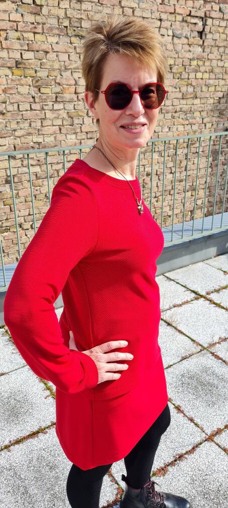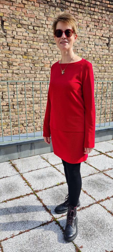 Look des Tages, heute mit einem weiteren Motiv von unserer lustigen Fotoproduktion zum Saisonauftakt: Sehen Sie das rote Ensemble von unserem deutschen Label Fox´s, bestehend aus einem schmalen, kurzen Rock und einem passenden Oberteil. Im Original ist der rote Farbton eher gedeckt, nicht so leuchtend wie im Bild. Mit dicken Strümpfen und Boots ist die Kombination alltagstauglich, mit dünneren Strümpfen und zum Beispiel Pumps oder mittelhohen Stiefeletten eignet es sich auch für festlichere Anlässe. Und wenn es einem zu rot wird – dann nimmt man das Ensemble einfach auseinander und kombiniert es nach Herzenslust mit anderen Teilen. Natürlich sind die beiden Teile bei uns oben auch einzeln erhältlich. Ich kann nur sagen: Wir sind ziemlich begeistert. Wir wünschen Ihnen einen schönen Sonntag. Ihr Modeversteck-Team.