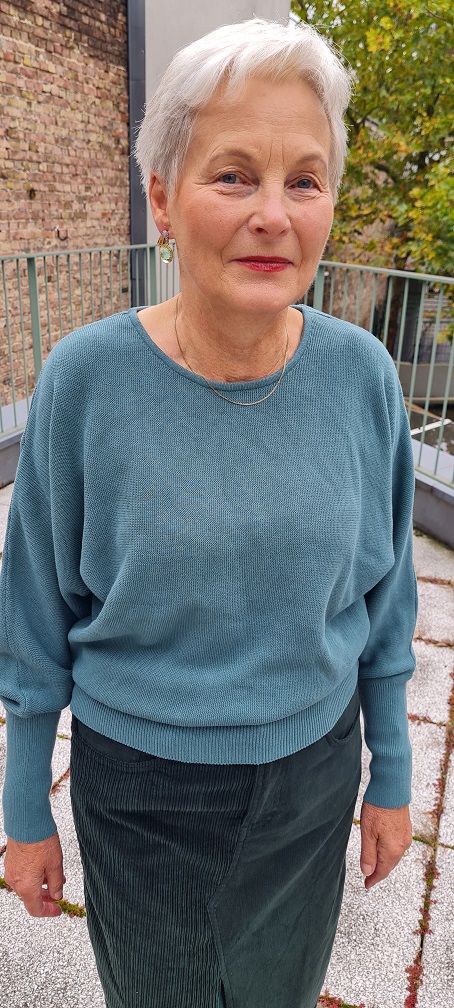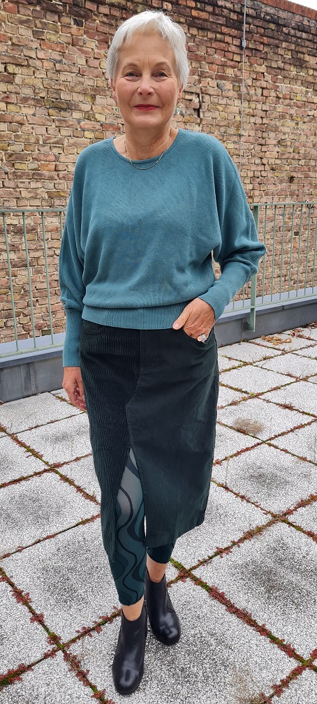 Look des Tages: Sehen Sie heute unseren hoch geschlitzten Rock aus zwei verschiedenen Cordstoffen, beide in der magischen Farbe Dunkelgrün. Dazu gibt es den farblich perfekt passenden Pullover aus 100% Biobaumwolle. Beides kommt aus Spanien, die gemusterten Leggins sind ausgeliehen (Modeversteck-Kenner wissen, von wem :-). Der Schmuck kommt natürlich von Konplott.