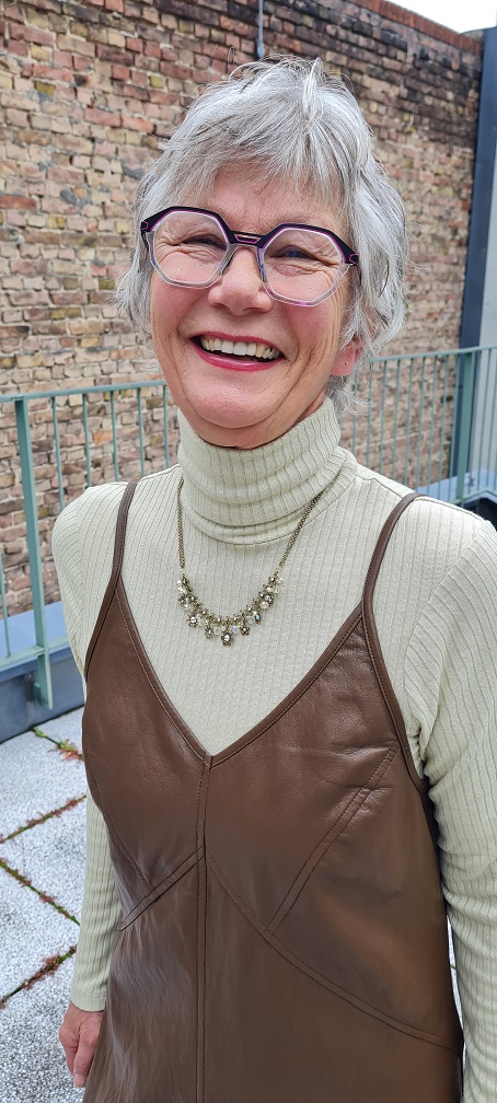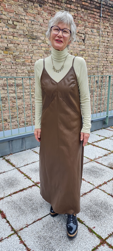 Look des Tages mit unserem extravaganten, langen Kleid in einer A-Linie, mit verstellbaren Spaghetti-Trägern. Es ist aus Fake-Leder in der Farbe Braun gemacht. Dazu gibt es einen kleinen Strickrolli aus Spanien – garantiert nicht kratzend. Für unsere Kollegin könnte das Kleid etwas kürzer sein, dazu beraten wir dann im Einzelfall und kümmern uns auch gern um die Ausführung. Ganz toll passt hier auch das Collier von Konplott, was meinen Sie?