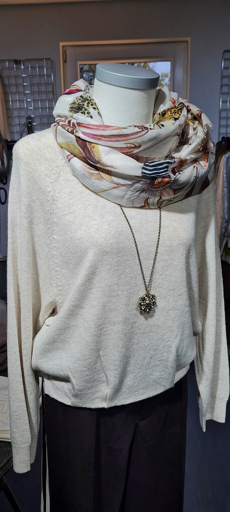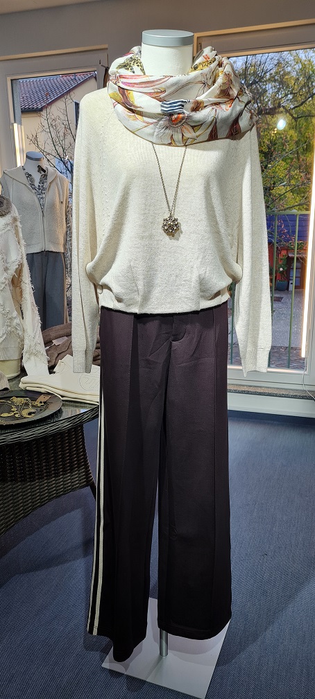 Look des Tages – zum langen Wochenende schön bequem, aber nicht zu lässig: Sehen Sie die dunkelbraune Hose aus einer fließenden Viskosemischung, mit seitlichen Galonstreifen, Taschen und Biesennähten an den Vorderseiten, in der Kombination mit dem neuen Strickpulli in einem Naturton. Er hat seitliche Knopfreihen und lässt sich damit – je nach Look – variieren. Dazu gibt es den neuen Schmuck von Konplott.