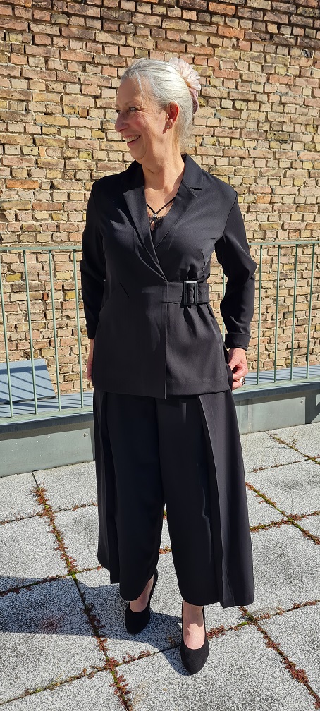 Look des Tages mit dem mega eleganten Zweiteiler aus Dänemark. Sehen Sie eine super sitzende Cullottes aus einem schweren, schwingenden Winterstoff. Auf der Rückseite wird noch eine Art Schößchen oberhalb des Po`s angedeutet. Mit anderen Worten: Die Hose lässt sich auch ganz toll mit kurzen Pullovern oder eingesteckten Blusen kombinieren. Aber heute zeigen wir sie mit einem überschnittenen, tailliert gearbeiteten, langen Blazer mit seitlich angesetztem Gürtel. Dazu braucht es eigentlich nur Unterwäsche. Bei kalten Temperaturen macht sich ein Rolli besonders schön dazu.