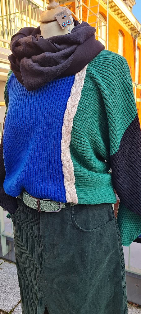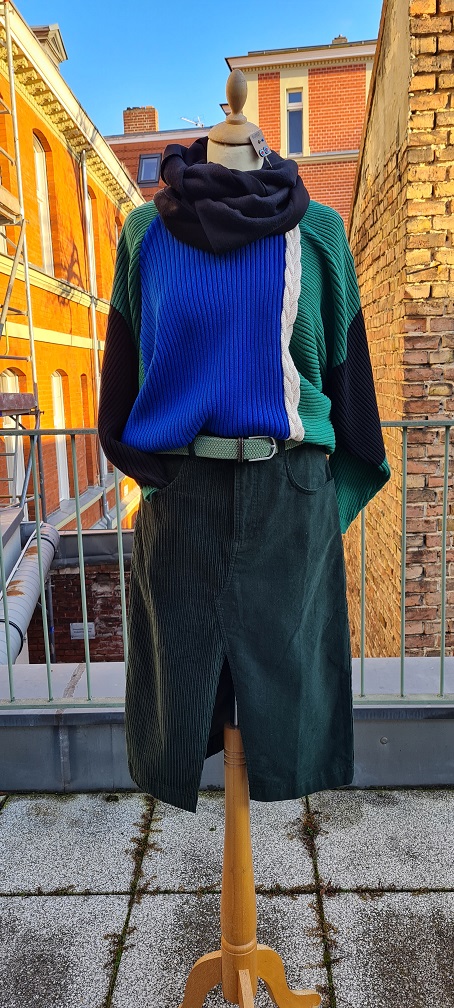 Look des Tages, heute mit dem sexy Cordrock in Dunkelgrün. Er ist an der Vorderseite hoch geschlitzt und aus zwei verschiedenen Stoffen zusammen gesetzt – sehr extravagant. Dazu zeigen wir den dicken Baumwollpullover in Royalblau und Grün, mit einem hellen Zopf mittendurch, beides stammt aus Spanien. Dazu gibt es den passenden Stretchgürtel und Ohrringe von Konplott.