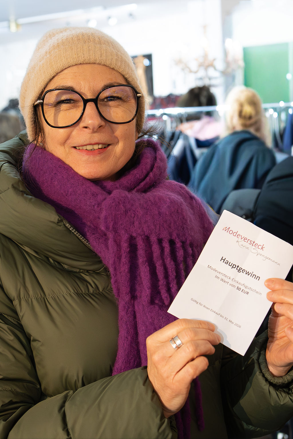 Look des Tages, heute mit den ersten Eindrücken von unserer weihnachtlichen Modenschau am vergangenen Samstag. Es war großartig. Die Bläser vom Weinladen am Kanal haben die Gäste draußen vor der Tür weihnachtlich eingestimmt, dann kamen die Models und stellten Kerzen am Laufsteg auf, die Show konnte beginnen. Zu fast jedem Look hatte unser Partner Markus Maroscia von Dreock Optik die passende Brille dabei. Es gab insgesamt vier Durchläufe der neun Models, zum Schluß hatte sogar noch der Weihnachtsmann seinen Auftritt auf unserem roten Teppich vor der Tür und hat Gewinnspiel-Lose ausgegeben, die direkt anschließend bei uns oben in der Boutique eingelöst werden konnten. Zusammen mit den Teams vom Weinladen, Dekostübchen, Eiscafé am Stübchen und Fitbox haben wir ein ansehnliches Weihnachtsprogramm in der Bahnhofstraße auf die Beine gestellt. Ich danke allen Mitwirkenden. Und von uns allen zusammen gehen die besten Wünsche an unsere zahlreichen, geduldigen, kälteresitenten und bestens gelaunten Gäste: Haben Sie rundum schöne Weihnachten. Karin Spengemann