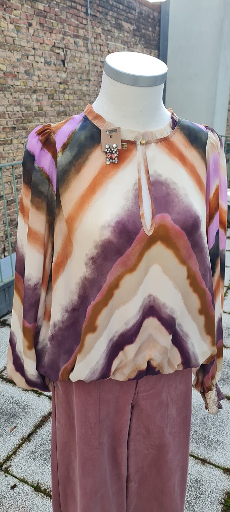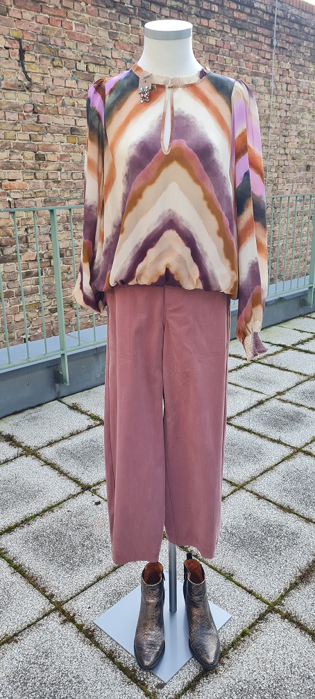 Look des Tages mit einer weich fließenden Bluse aus 100% Cupro, mit gesmokten Bündchen und ganz leicht ausgeformten Puffärmeln, schön weiblich. Sie bildet einen spannenden Gegensatz zur eher lässig geschnittenen Hose von Fox`s – wir lieben das! Farblich kann die Kombination harmonischer nicht sein. Natürlich haben wir die passenden Ohrringen für den Look. (Schuhe: privat)