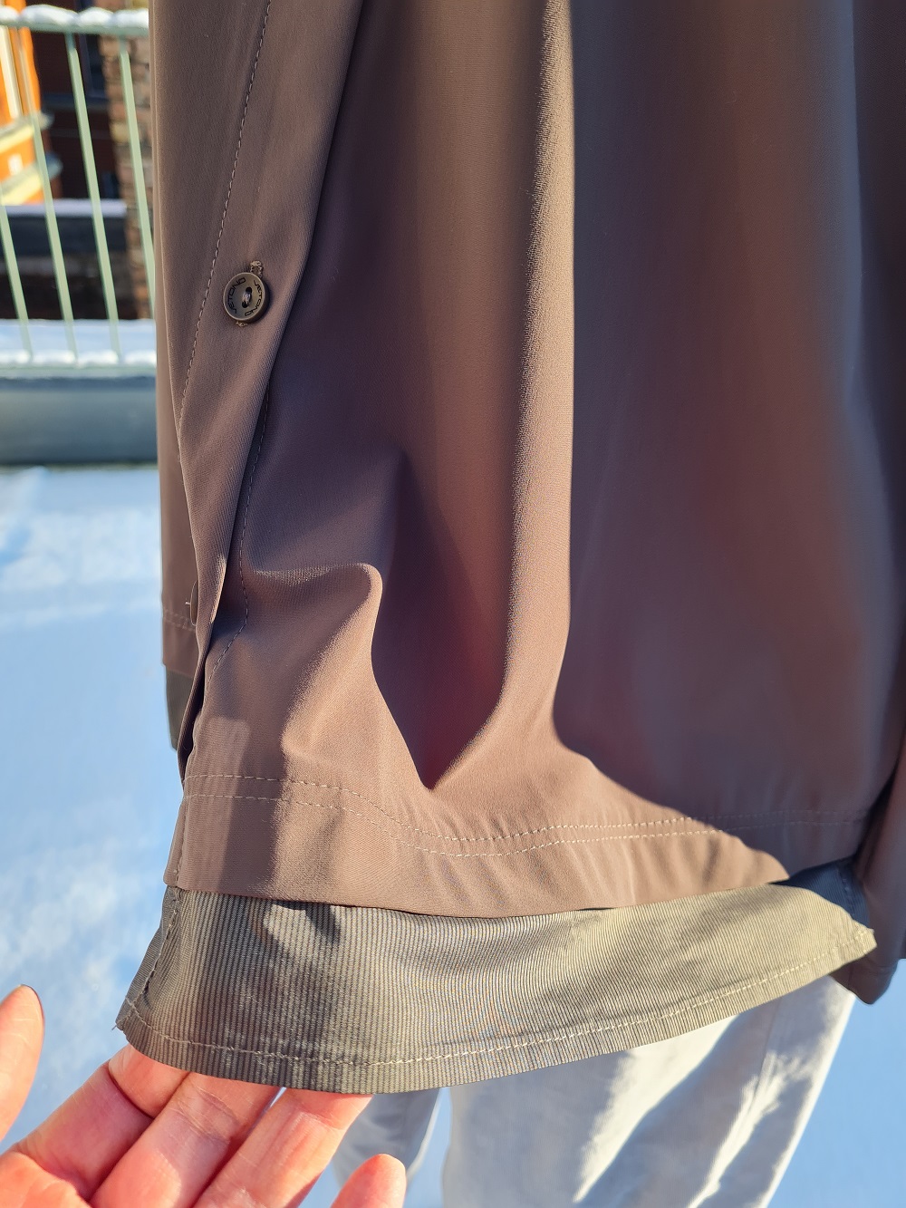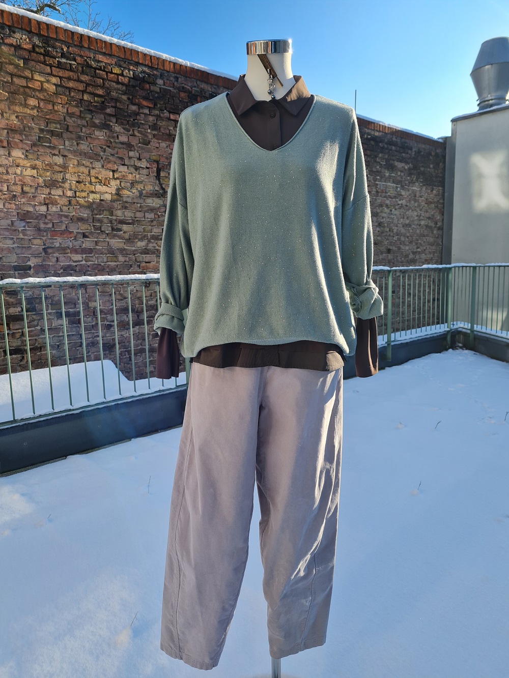 Look des Tages mit dem zartolivgrünen, ganz dezent glitzernden Pullover aus einer angenehm fein verarbeiteten Viskosemischung. Er fällt fast wie eine Bluse (EUR 129,95). Und zwar hier zu sehen mit einer dunkel olivgrünen Bluse aus einer glatten Microfaser. Sie hat am unteren Saum als kleine Besonderheit noch einen eng gestreiften Stoff angesetzt unterlegt (EUR 134,-). Um diese sanften Eindrücke zur Geltung zu bringen, kombinieren wir unsere silbergraue Feincordhose dazu. Dieser Look passt bis weit in den Frühling hinein. Kommen Sie zur Anprobe rauf zu uns? Oder besuchen Sie den neuen Online Shop. Wir wünschen Ihnen einen schönen Sonntag.