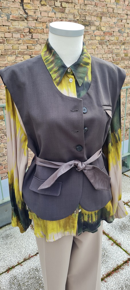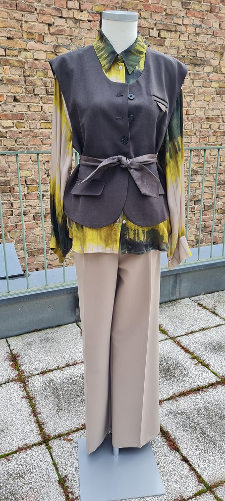 Look des Tages: Wir präsentieren heute eine dunkelbraune, breitschultrige Herrenweste mit etwas weiteren Armausschnitten, wodurch die Ärmel der eleganten, zugleich dezenten Viskosebluse nicht engeengt werden. Zur Weste gehört das kleine angedeutete Einstecktuch und eine passende Schluppe, die sich entweder zu einer Krawatte binden oder als Gürtel zum Betonen der Taille knoten lässt. Das beides zur Marlenehose führt zu einem ziemlich stylischen Look, sehr chic und besonders.