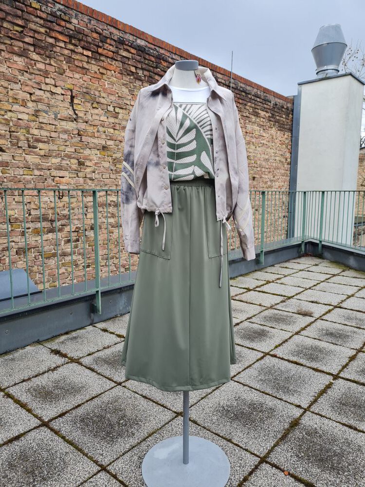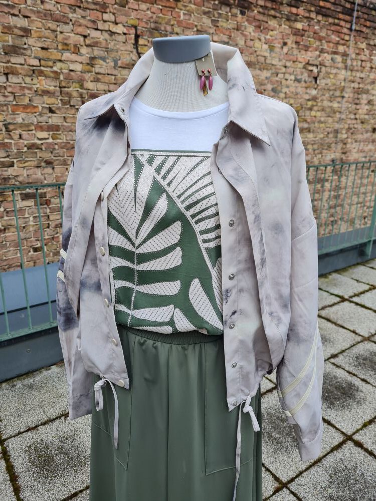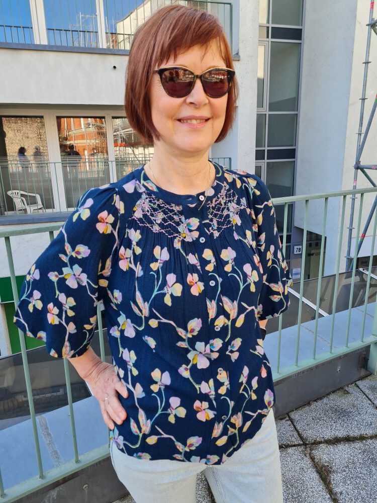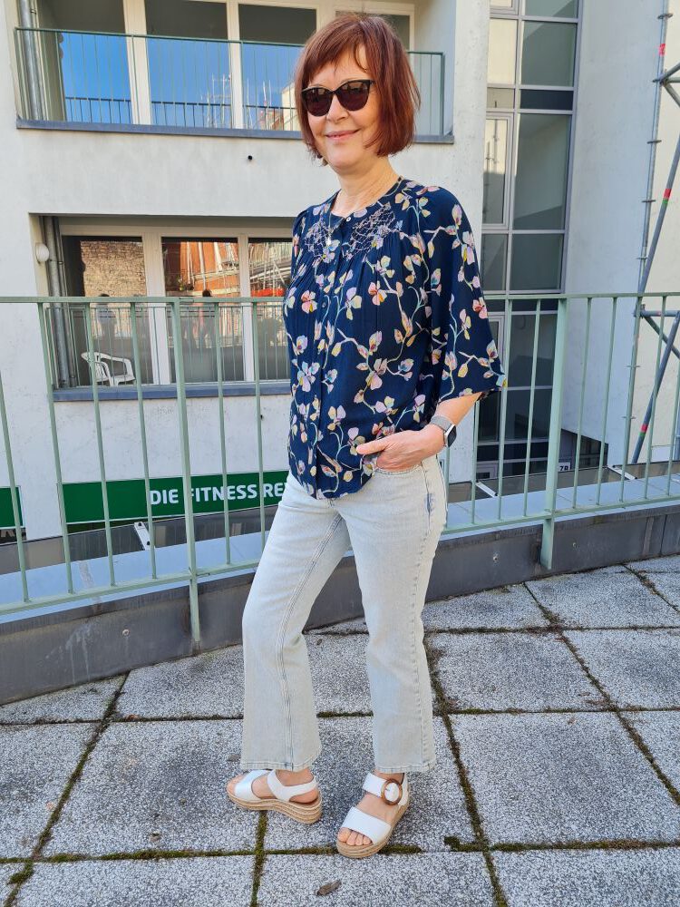 Look des Tages, heute mit einer zauberhaften Bluse an einem zauberhaften Gastmodel – diese beiden gehören zusammen! Sehen Sie eine dunkelblaue, leicht ausgestellt genähte Bluse mit relativ schmalen, verkürzten Raglanärmeln und durchgehender Knopfleiste. Sie hat am Ausschnitt und im Nacken gesmokte Partien, die zart bestickt sind. Ansonsten ist sie mit sehr phantasievollen Blumenranken bedruckt. Wir haben sie nur noch einmal bei uns oben (Größe S), könnten sie aber bei verstärktem Interesse aus Spanien nachbestellen. Unser Model trägt hierzu eine verkürzte, ebenfalls leicht ausgestellte Jeans, die Sie auch bei uns im Onlineshop finden können. Wir wünschen einen schönen Karfreitag.