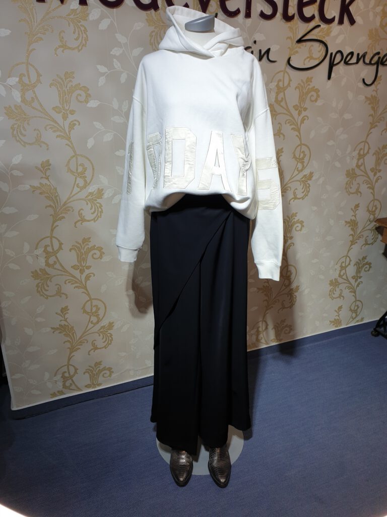 Look des Tages mit einem ersten Frühlingsteil aus der neuen Kollektion: Sehen Sie den Hoodie von 10Days, einmal in Braun, einmal in Weiß. Er ist oversize und ziemlich lässig gemacht. Am unteren Saum ist er leicht ausgefranst, hat also kein Bündchen. Innen drin fühlt er sich kuschelig weich an. Wir haben ihn hier zur eleganten Hose mit Überschlag von Summum und mit spitzen Stiefeletten kombiniert und finden es klasse! Alle Teile sind bei uns oben im Laden oder über unseren neuen Online Shop erhältlich.