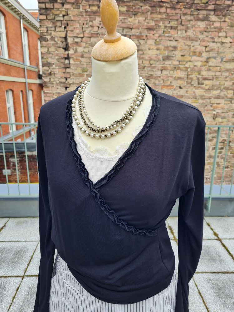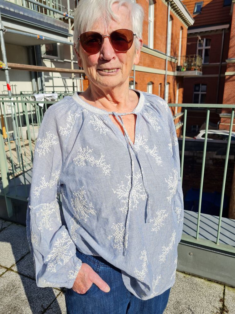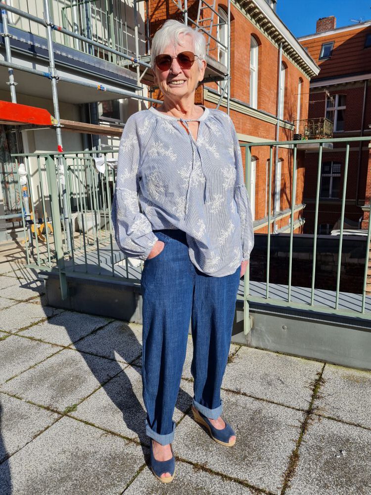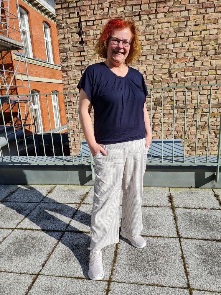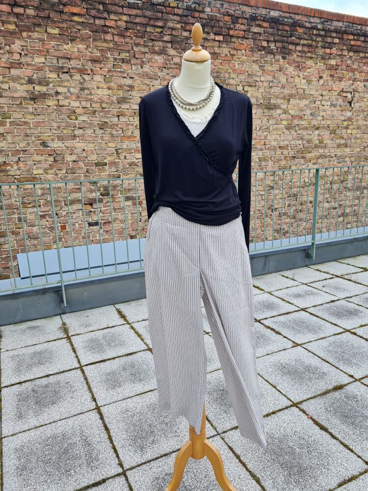 Wir zeigen die luftige, zart gestreifte und hell bestickte Bluse von Eve in Paradise. Sie lässt sich am Halsausschnitt locker zusammen binden und problemlos in einen Hosenbund einstecken. Denn dann wirken die Beine optisch schön lang. Besonders cool zur leichten Schlupfhose aus Tencel in Denimblau. Wir wünschen Ihnen allen einen schönen Sonntag. Ihr Modeversteck-Team