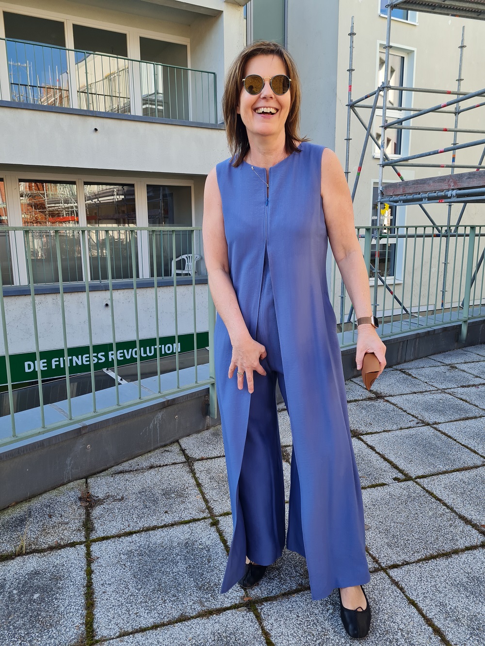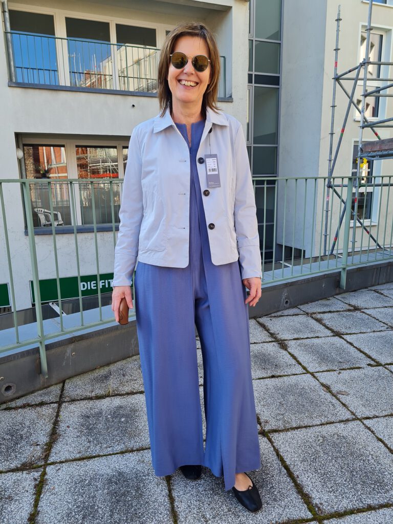 Look des Tages: Sehen Sie einen wunderschönen, weich fließenden Jumpsuit von Fox in einer schmal fallenden Form. Mit einer extra Lage Stoff, die an der Vorderseite leicht aufspringt und kaschiert, falls was kaschiert werden soll. Ein langer Reißverschluss vereinfacht das An- und Ausziehen ganz wunderbar. Und er sorgt für gute Laune, wie an diesen Motiven unschwer zu erkennen ist. Wir bedanken uns herzlich fürs Mitmachen, liebes Gastmodel. Übrigens zeigen wir dazu die kurze, kastige Jacke von White Label. Alles bei uns oben oder im Shop.