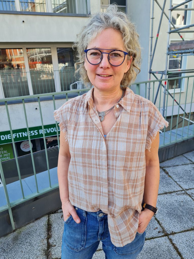 Look des Tages, heute mal extrem lässig – es ist ja Wochenende! Sehen Sie zu unserer kleinen, knöchellangen Sommerjeans von Summum ein weiches, kastig geschnittenes, kleinkariertes Top mit ausgefransten (aber sauber vernähten) Armausschnitten. Wunderschön auf der Haut, man sieht es unserem Gastmodel an, oder? An dieser Stelle einen herzlichen Dank fürs Posen. Dazu gibt es die letzte Leinenjacke in der Größe 36 bei uns oben.