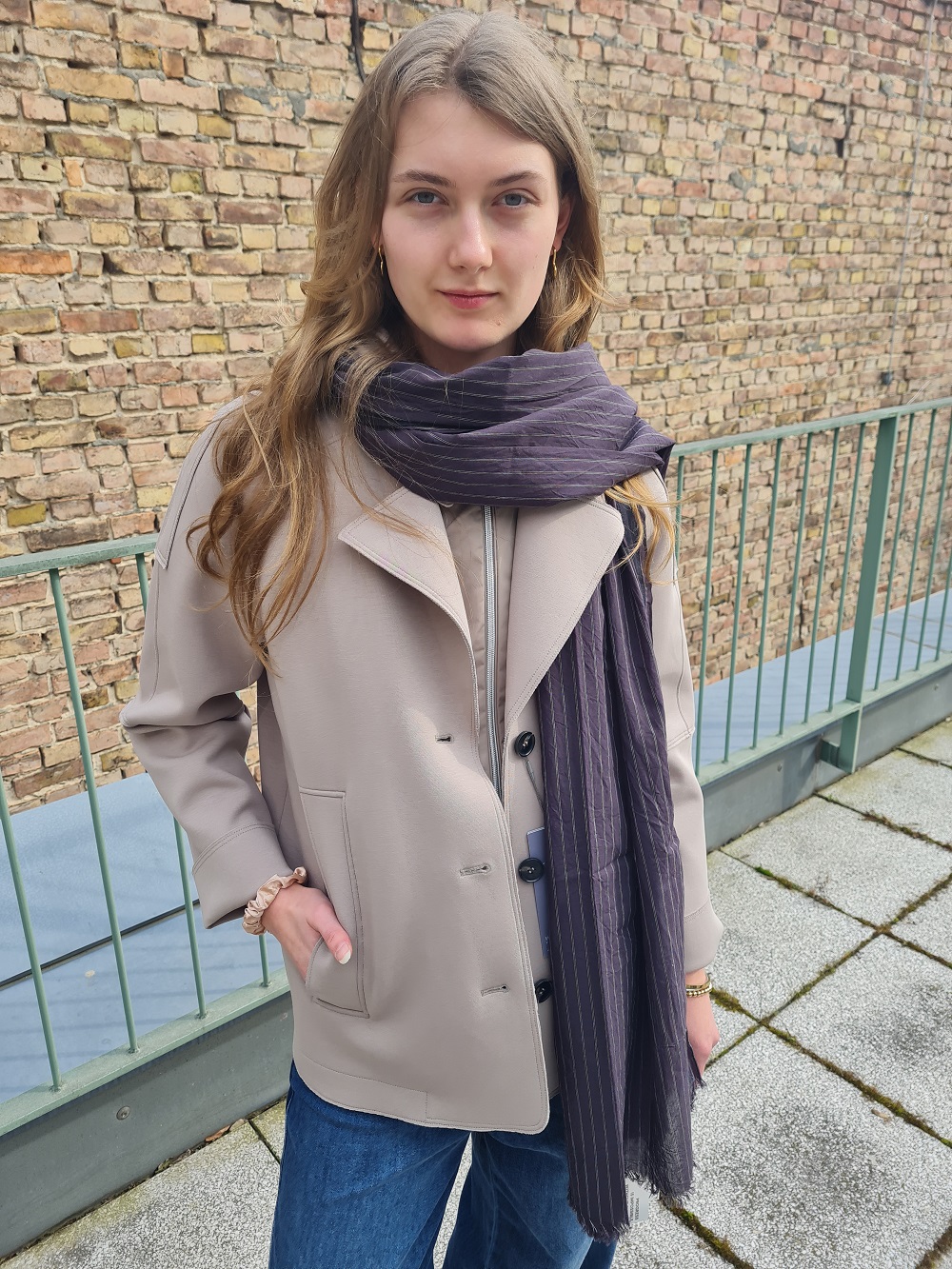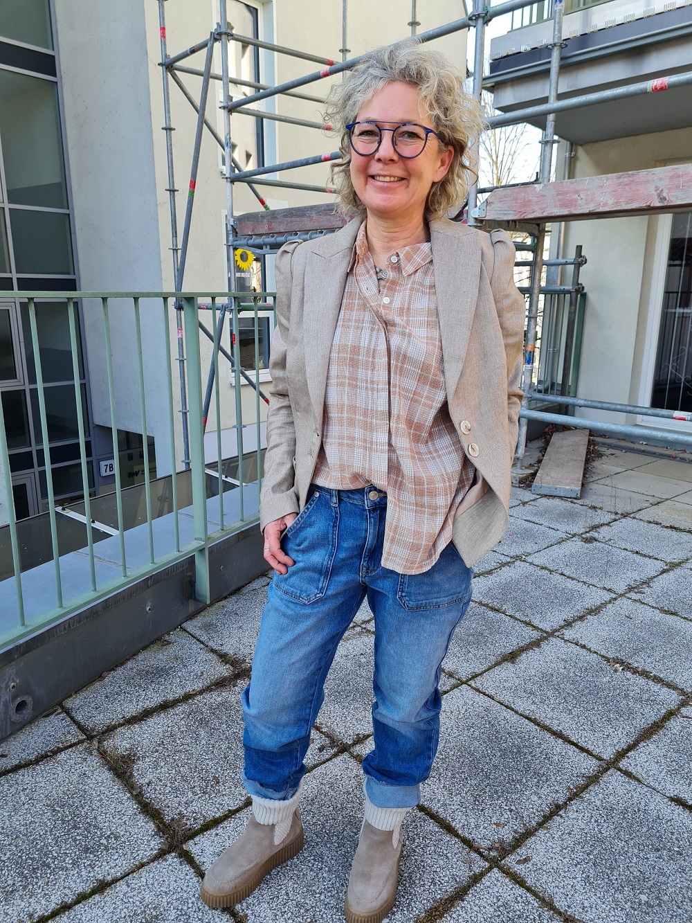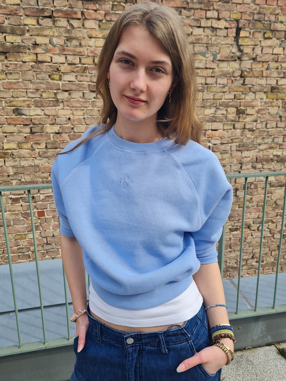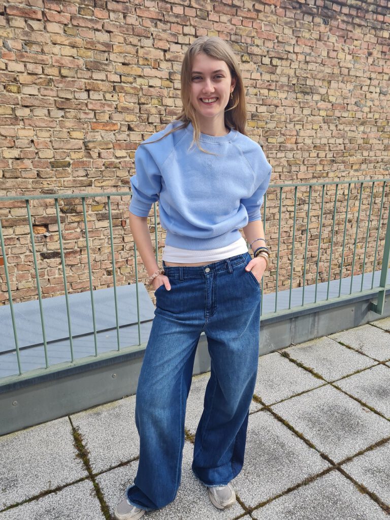 Look des Tages mit unserem heutigen Gastmodel Marlene: Sehen Sie zur extra dünnen und weiten und langen Sommerjeans, ein kurzes, himmelblaues Sweatshirt und dazu die Jacke mit ausknöpfbarem Innenteil von White Label. Alles bei uns oben oder im Shop.