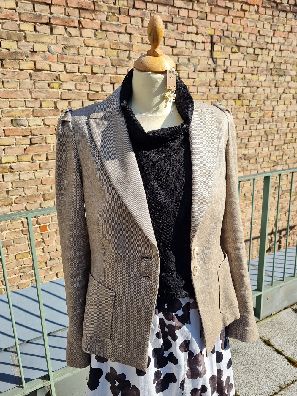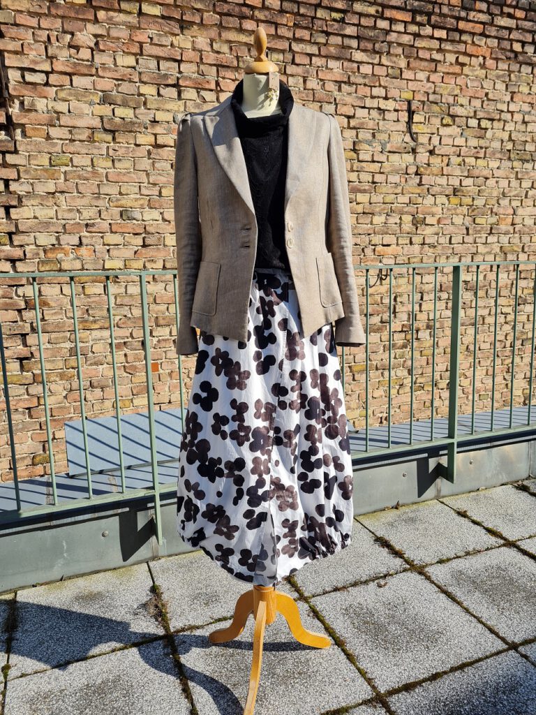 Look des Tages: In der letzten Woche ist wieder eine schöne Sendung von unserem neuen Label Karma eingetroffen – sehr erlesene Designs! Sehen Sie heute als Hauptakteur den schönen, super leichten Baumwoll-Rock mit Taschen und Stretchbündchen. Er dürfte sich bei großer Hitze wunderbar tragen. Etwas Glamour bringen wir mit dem Spitzentop von NÜ ins Spiel. Unser letzter Leinenblazer (Größe 36) rundet den Look ab. Außerdem ist es ja noch nicht so warm. Rock und Top gibt es ab sofort auch bei uns im Shop.