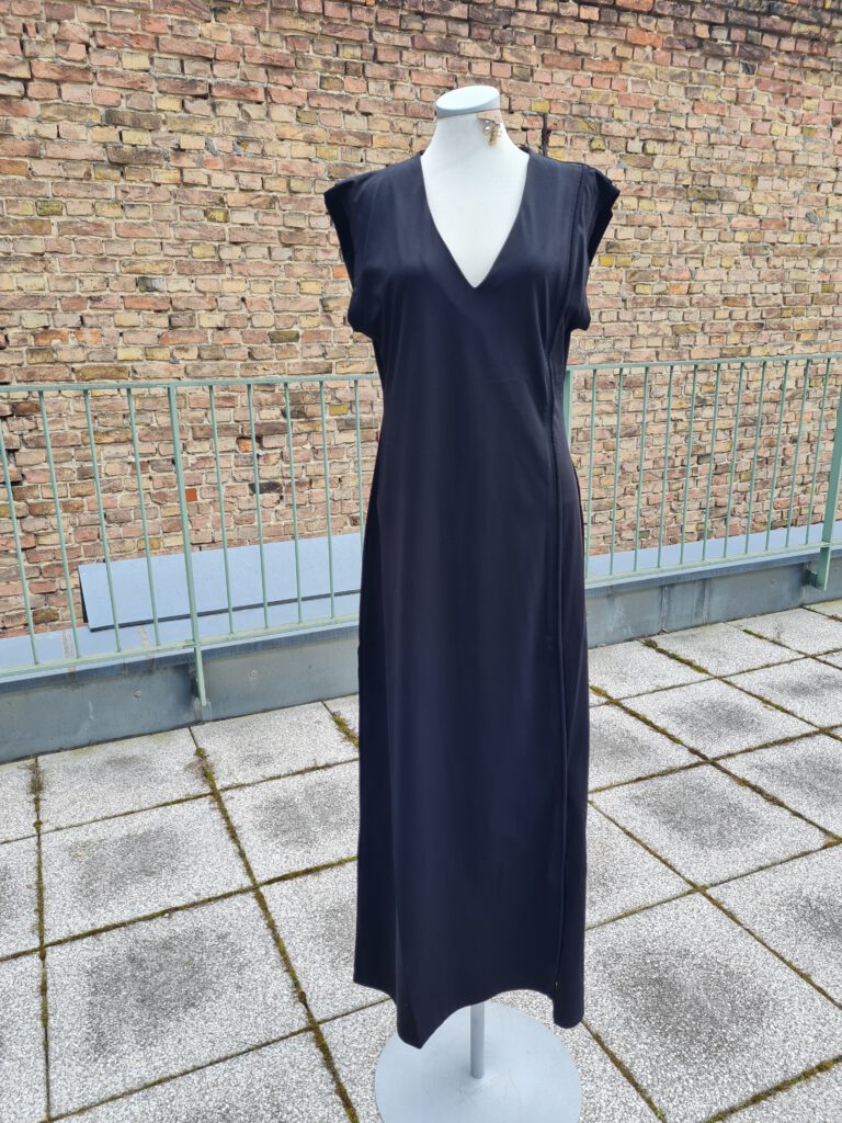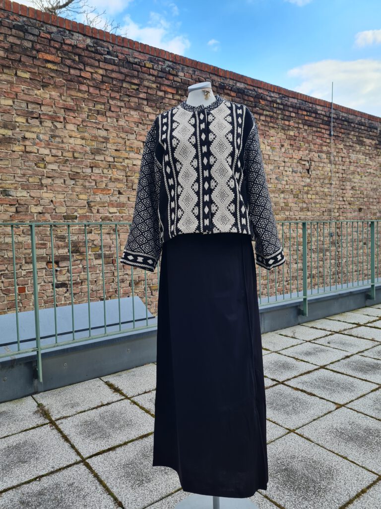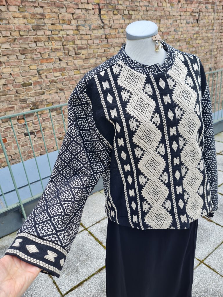 Look des Tages mit einer zweilagigen Jacquard-Jacke zum Wenden über einem langen, schwarzen Baumwollkleid aus Spanien. Die Jacke ist hervorragend verarbeitet, mit einer verdeckten Knopfleiste, einem Rundhalsausschnitt und weiten, langen Ärmeln (ohne Taschen). Sehen Sie die Materialien und die Innenseite sowie das vielseitige und bequeme Kleid bei uns oben oder im neuen Onlineshop.