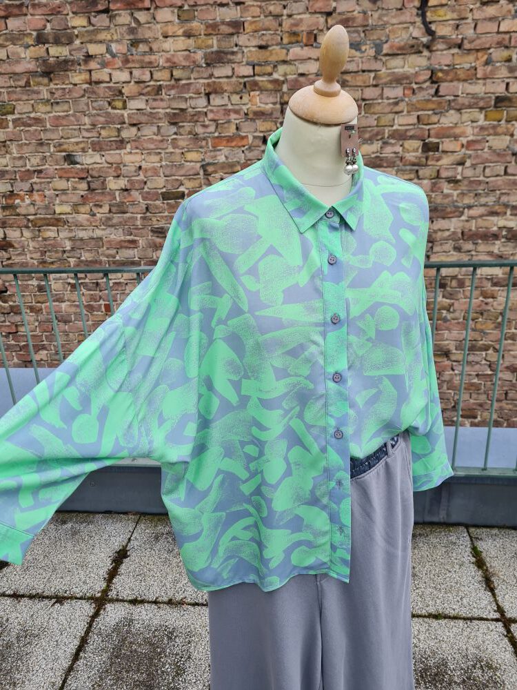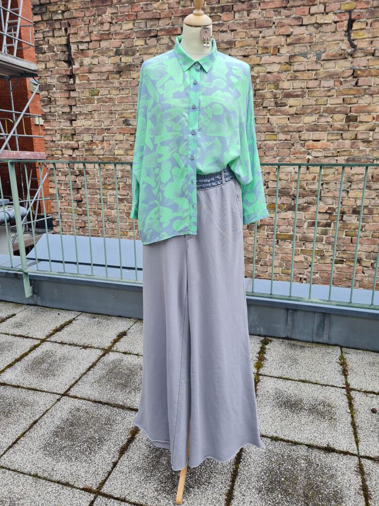 Look des Tages: Wir gehen gut gelaunt (trotz grauen Himmels) und voller Vorfreude in die Osterwoche. Sehen Sie die neu eingetroffene Bluse aus zarter, weich fließender EcoVero-Viskose von SKFK aus Spanien zur extra weitbeinigen Jogger in Grau mit einem glänzenden Stretchbündchen von 10Days. Die Bluse ist dünn genug, um sie einzustecken. Aber sie sieht dank der deutlich längeren Rückseite auch locker hängend sehr lässig aus. Beides bei uns oben oder im Onlineshop.