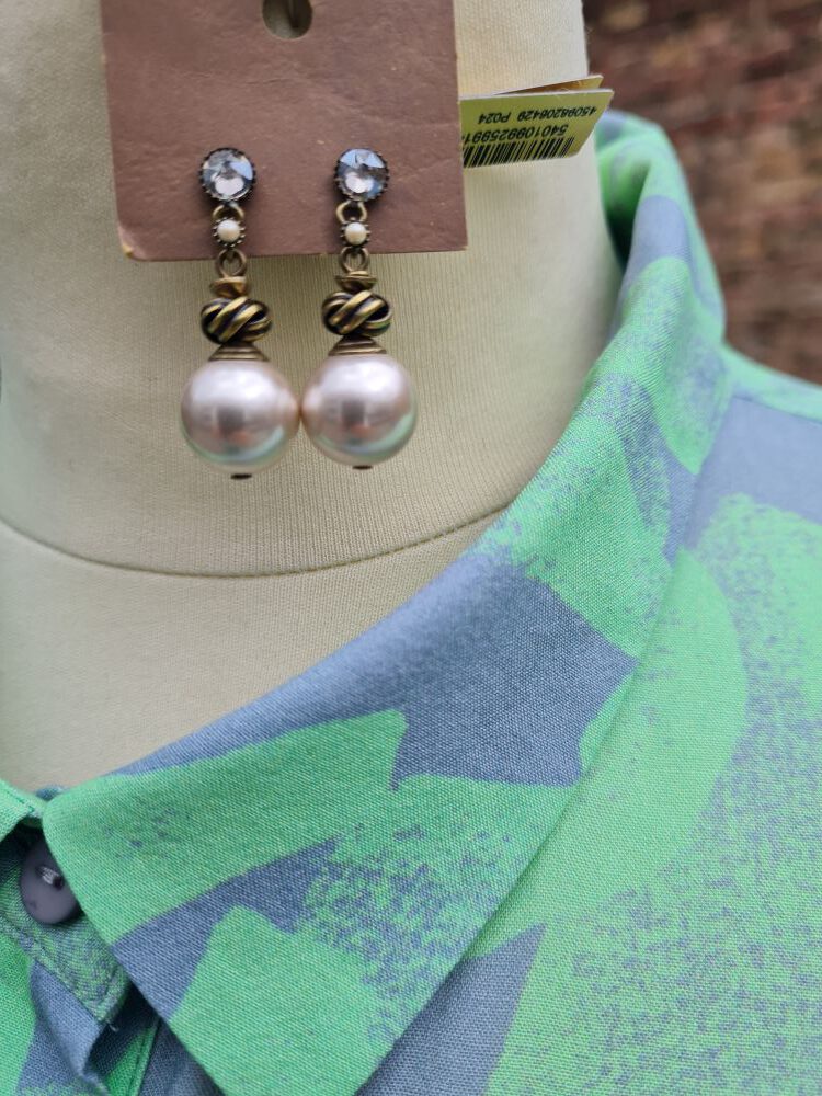 Look des Tages mit der eleganten Pünktchenbluse aus einer seidig schimmernden Viskose-Baumwollmischung von Summum. Sie ist vorne etwas kürzer geschnitten und fällt auf der Rückseite durch eine extravagante Schnittführung rund und weit, bis über den Po. Hier gibt es einen leichten Sommerrock mit Stretchbündchen in der Farbe Khaki dazu. Und wunderschöne Perl-Ohrstecker von Konplott.