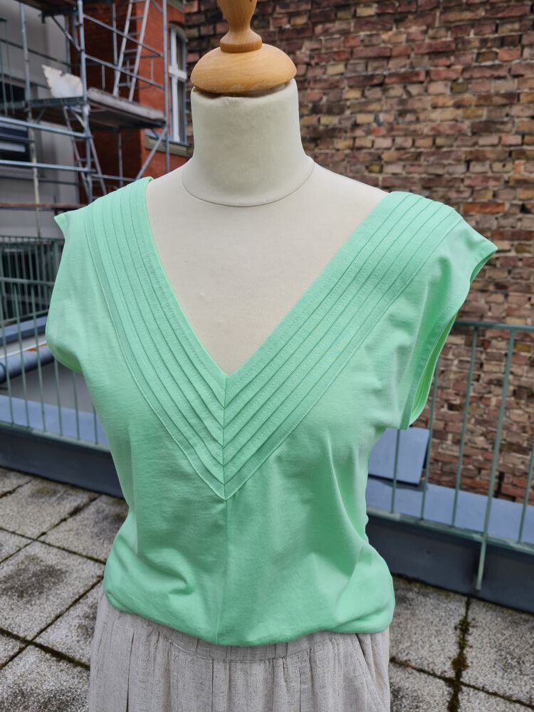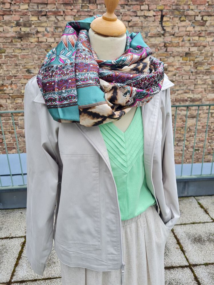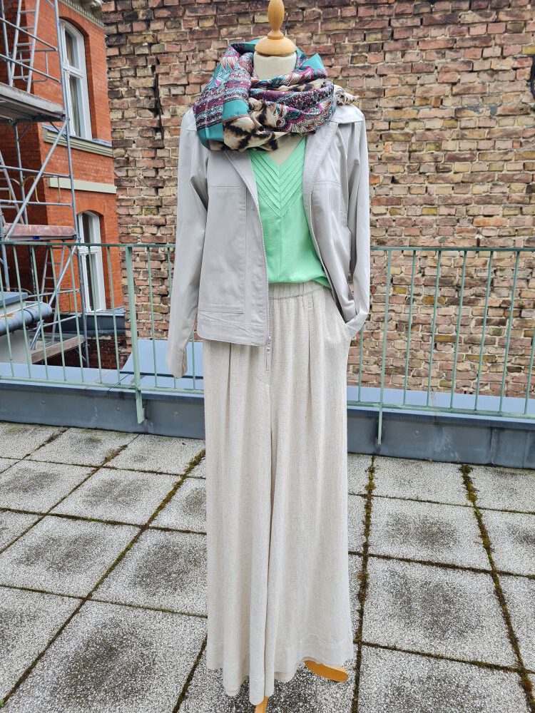 Look des Tages in freundlichen Farben und aus den Stoffen des Sommers – auch wenn er noch nicht da ist. Sehen Sie zur locker hängenden, beigefarbenen Hose aus einem angenehm tragbaren Viskose-Leinengemisch (mit Stretchbündche), ein strahlend grünes Top mit einem tiefen V-Ausschnitt, aus Biobaumwolle. Darüber gibt es eine kleine, gerade geschnittene Jacke, ebenfalls aus Biobaumwolle. Alle Teile gibt es bei uns oben oder im neuen Onlineshop.