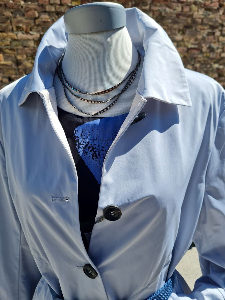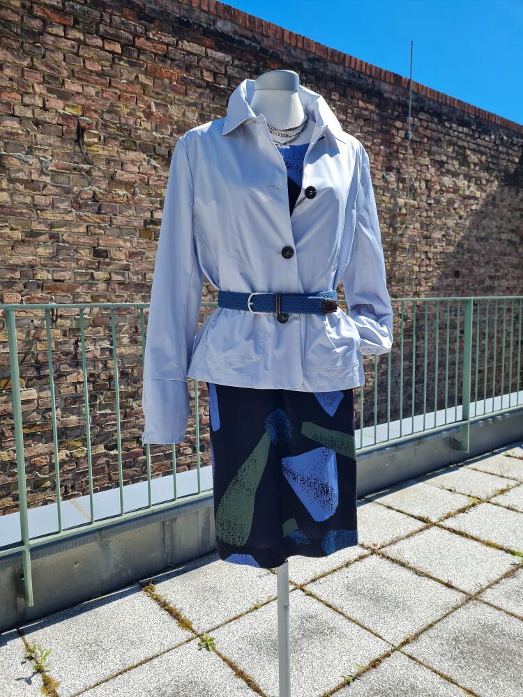 Look des Tages: Sehen Sie den Oversize-Blazer in einem sommerlichen Hellblau eng mit einem Gürtel umschlungen. Wir finden es super, wie wandelbar dieser Allrounder ist. Unter dem Blazer kommt eine halbtransparente Tunika mit eingewebten Blüten zum Vorschein. Dazu gibt es unsere dünne Sommerjeans. Alle Teile bei uns oben oder im Onlineshop.