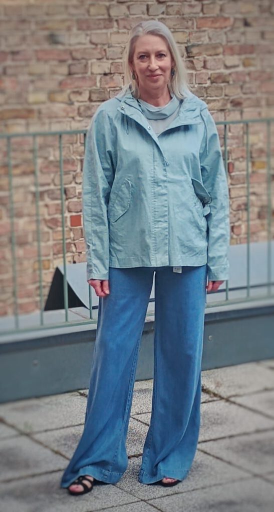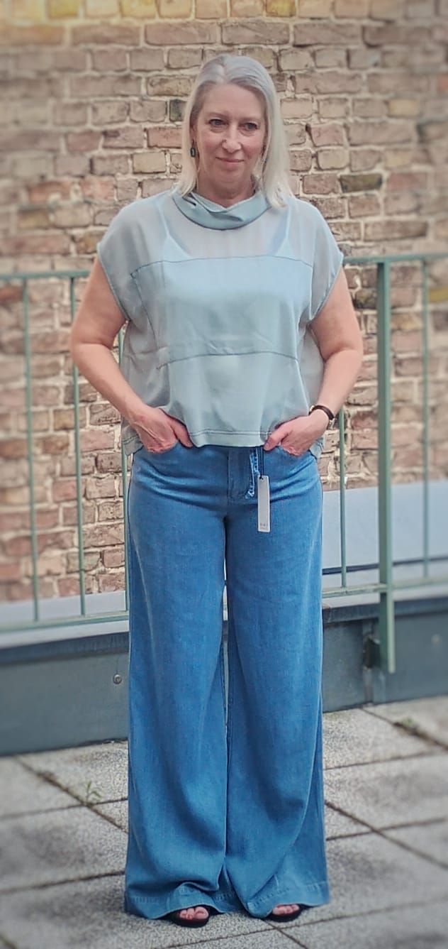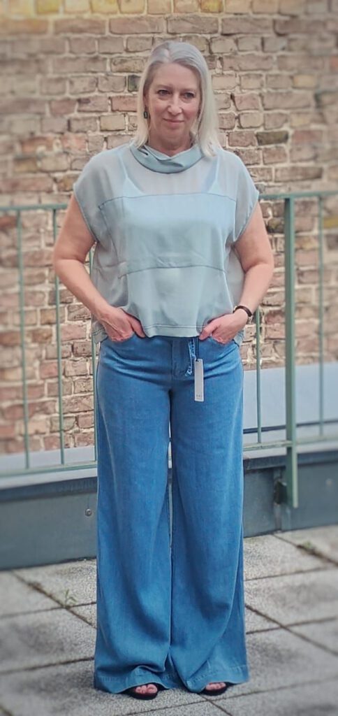 Look des Tages mit zwei Schnappschüssen von unserer kleinen Sommer-Modenschau in der letzten Woche. Sehen Sie zur mega langen und hoch geschnittenen Palazzohose von OUI aus weich fließendem Lyocell-Gewebe ein halbtransparentes Top in einem zarten Mint-Ton. Oben drüber gibt es eine passende Hochsommerjacke von LangerChen. Alles bei uns oben oder im Onlineshop.