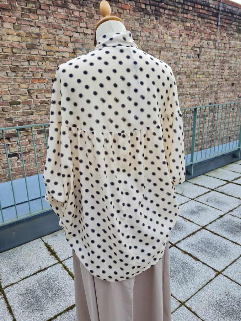 Look des Tages mit der eleganten Pünktchenbluse aus einer seidig schimmernden Viskose-Baumwollmischung von Summum. Sie ist vorne etwas kürzer geschnitten und fällt auf der Rückseite durch eine extravagante Schnittführung rund und weit, bis über den Po. Hier gibt es einen leichten Sommerrock mit Stretchbündchen in der Farbe Khaki dazu. Und wunderschöne Perl-Ohrstecker von Konplott.