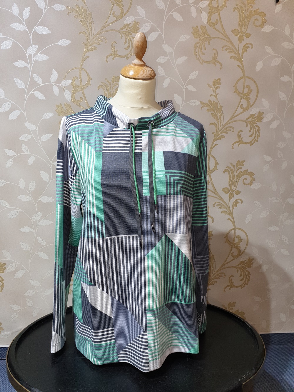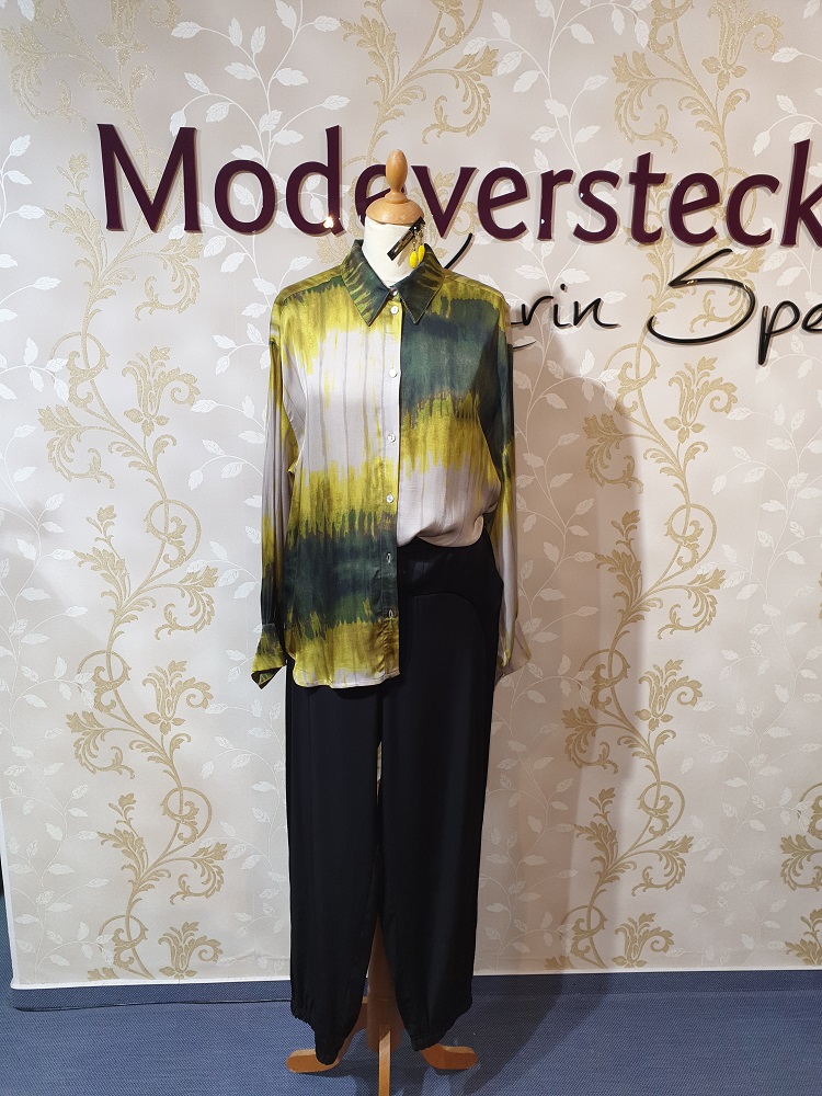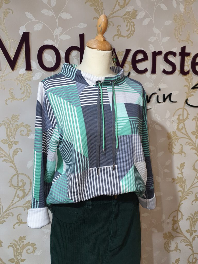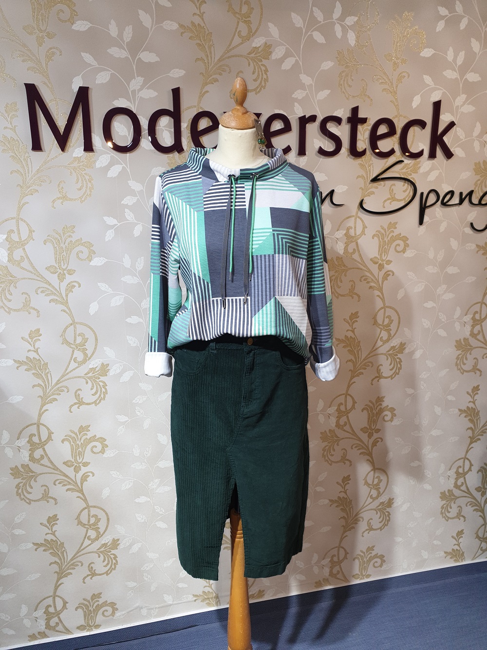 Look des Tages mit dem frischen, zugleich gemütlichen Pullover aus Jersey, in Grün-und Grauabstufungen. Er ist dünn genug zum Einstecken, daher haben wir ihn mit dem grünen, hoch geschlitzten Cordrock von SKFK aus Spanien kombiniert. Er trägt sich in voller Länge aber auch prima zu Hosen. Wir haben beides noch bei uns oben (oder natürlich im Online Shop).