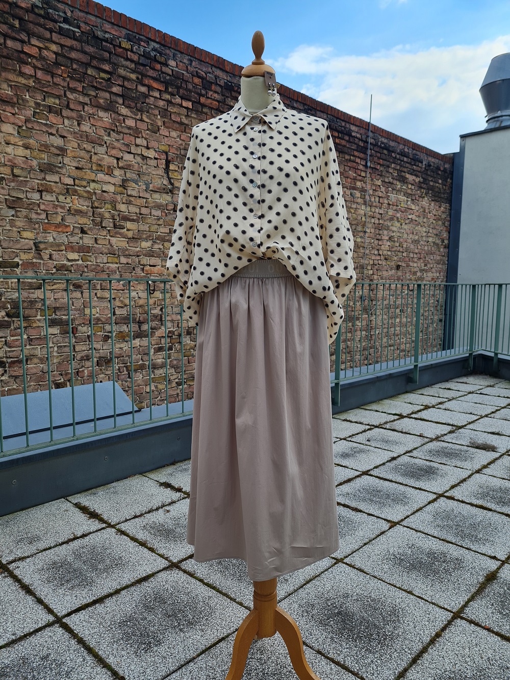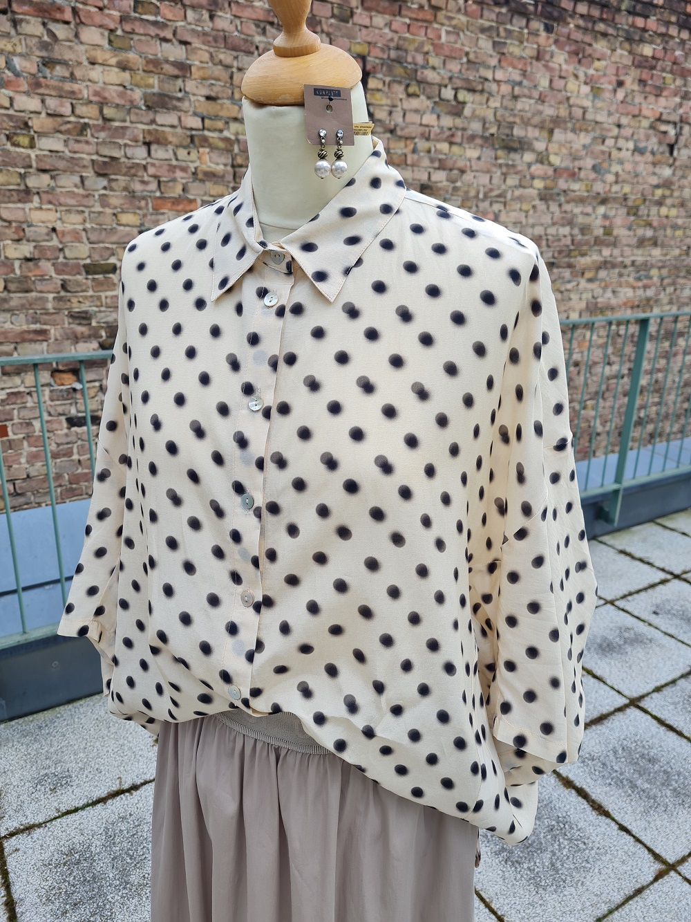Look des Tages mit der eleganten Pünktchenbluse aus einer seidig schimmernden Viskose-Baumwollmischung von Summum. Sie ist vorne etwas kürzer geschnitten und fällt auf der Rückseite durch eine extravagante Schnittführung rund und weit, bis über den Po. Hier gibt es einen leichten Sommerrock mit Stretchbündchen in der Farbe Khaki dazu. Und wunderschöne Perl-Ohrstecker von Konplott.