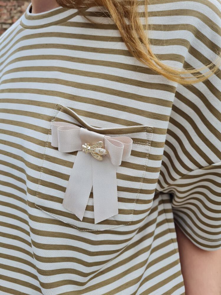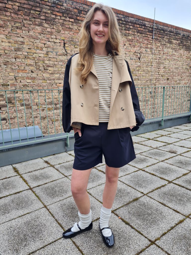 Look des Tages, heute mit einem lustigen, kurz geschnittenen Ringelshirt von Summum zur schwarzen Shorts. Die kleine Schleifenbrosche gehört dazu, kann aber natürlich beliebig abgenommen werden. Uns gefällt die weite Trenchjacke besonders gut dazu. Shorts haben wir in diversen Modellen bei uns oben, den Ringelpulli oder die Jacke finden Sie auch im Shop.