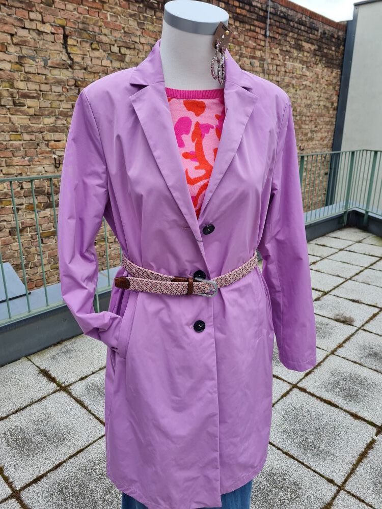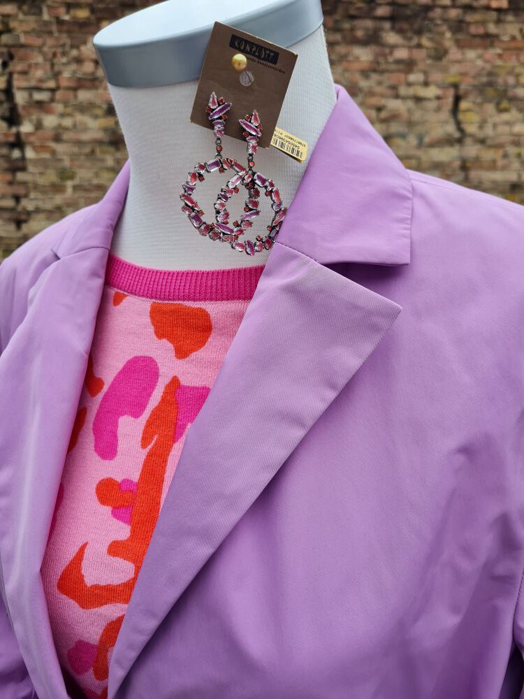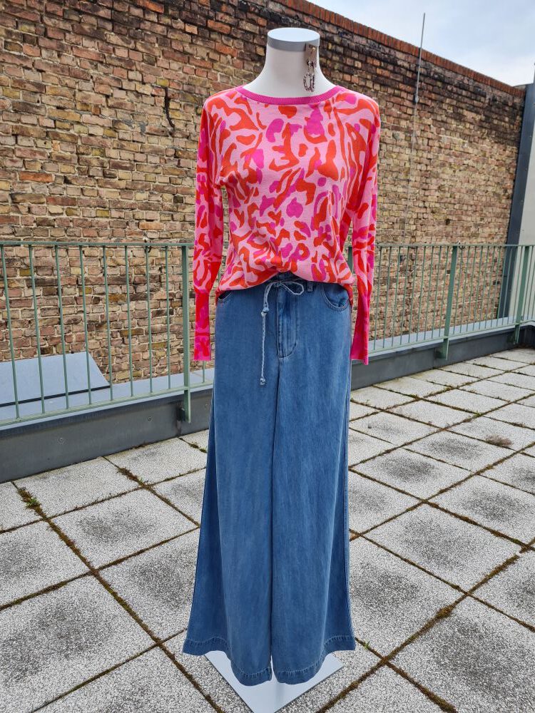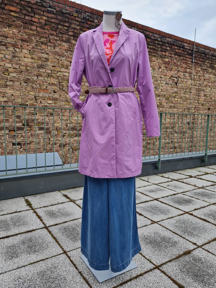 Look des Tages in den schönsten Farben des Frühlings (jetzt müsste nur noch die Sonne scheinen): Sehen Sie die weich fließende, ganz dünne Palazzo-Hose von OUI in Denimblau zusammen mit dem gemusterten Baumwoll-Feinstrickpulli von Eve in Paradise in einer fröhlichen Orange-Pink-Rosé-Farbmischung. Dazu gibt es den Frühlingsmantel in einem leuchtenden Violett. Alles bei uns oben oder im Onlineshop.