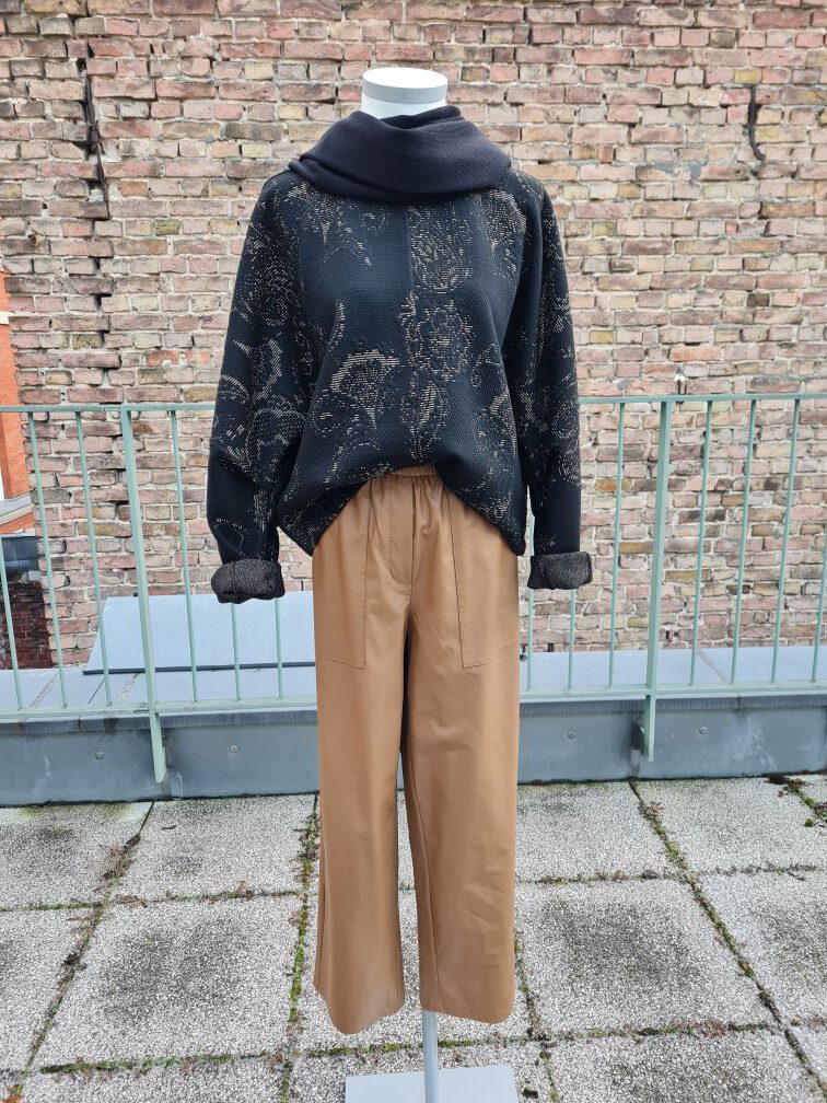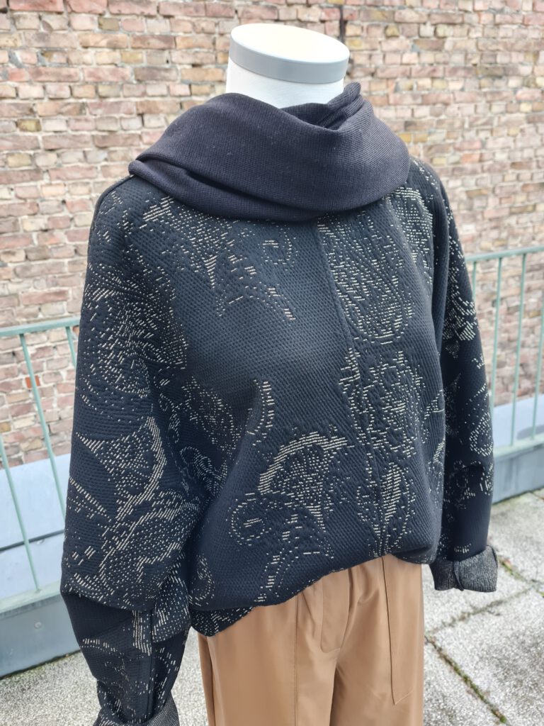 Look des Tages, heute schön festlich und zugleich etwas wärmer: Sehen Sie das elegante Sweatshirt mit Raglanärmeln in Schwarz mit dezent goldenen, eingewirkten Ornamenten. Es ist hoch geschlossen (hier durch einen Loop verdeckt) und hat einen Rundhalsausschnitt. Die Ärmel sind rundlich geschnitten, ein tolles Teil. Für Silvester empfehlen wir noch schnell einen Besuch bei uns oben. Ansonsten steht es jetzt auch bei uns im neuen Online Shop. Dazu sehen Sie übrigens eine Fakelder-Jogpant von OUI als Einzelstück aus dem Sale. Rutschen Sie heute Abend in ein zufriedenes, gesundes neues Jahr. Ihr Modeversteck-Team