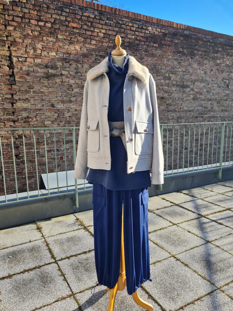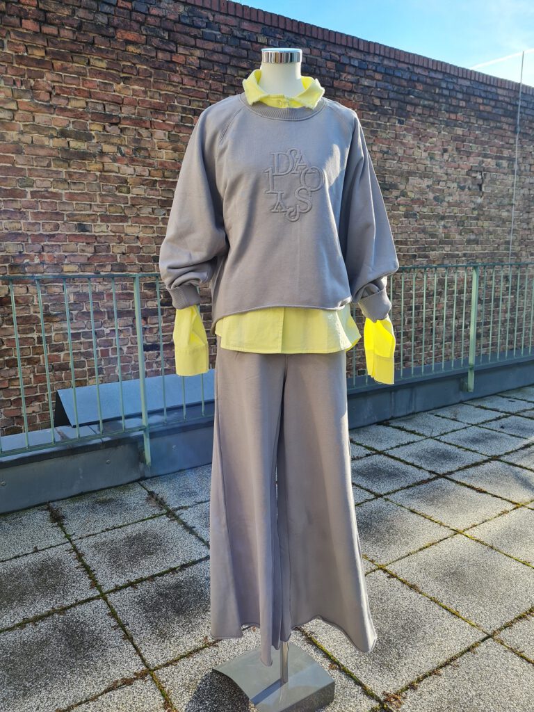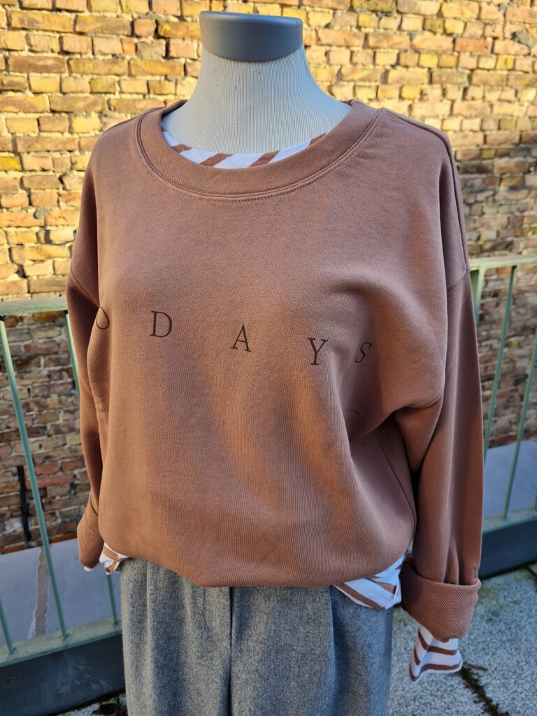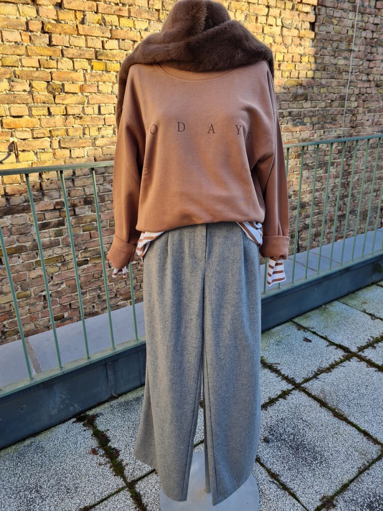 Look des Tages, heute mit dem neu eingetroffenen Sweatshirt von 10Days in der besonderen Farbe Fudge (oder Toffee). Dazu gibt es ein langärmliges Basicshirt aus Baumwolle mit Leinen und die graue Wollhose von Eve in Paradise – es ist ja noch nicht so warm. Alle Teile ab sofort auch online erhältlich.