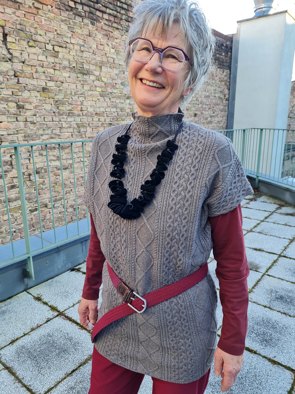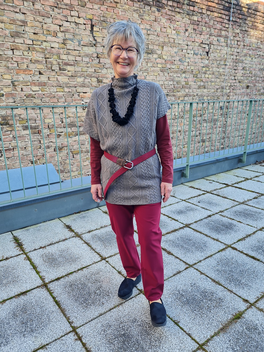 Look des Tages mit einem sehr angenehm wärmenden, nicht kratzenden Pullunder in der Farbe Graphit. Er hat in der Ärmellänge eine leichte Asymmetrie eingearbeitet, was im ersten Moment kaum auffällt. Er ist übrigens seit heute im Super Sale, finden Sie weitere Informationen bei uns im Online Shop oder kommen rauf ins Modeversteck. Wir finden übrigens, dass der Pullunder sich ganz besonders gut in der Kombination mit der Farbe Weinrot macht – was sagen Sie dazu? Wir haben jedenfalls auch unsere letzten drei weinroten Minxhosen deutlich reduziert.