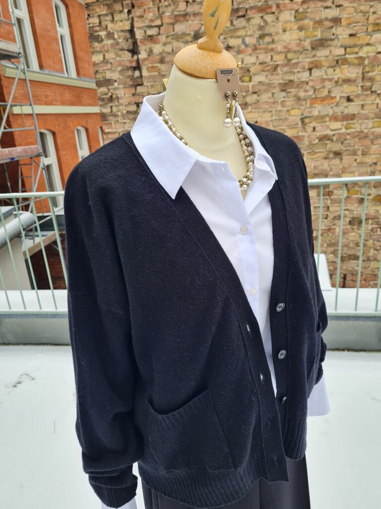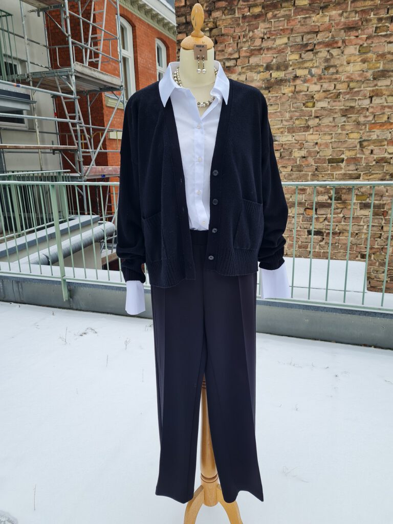 Look des Tages – heute sehr klassisch, sehr stilvoll. Sehen Sie zur festlichen, schwarzen Hose eine weiße Bluse mit Kragen und breiten Manschetten. Darüber gibt es die wunderbare, schwarze Woll-Strickjacke von Eve in Paradise. Sie ist relativ kurz und kastig geschnitten, mit Strickbündchen am unteren Saum und an den Ärmeln. Der Ausschnitt ist im zugeknöpften Zustand V-förmig und tief. Ein sehr variabel einsetzbares, wertiges Stück, wir haben die Jacke noch zwei Mal bei uns oben oder im neuen Onlineshop. Perlenschmuck macht sich übrigens gut dazu. Wir wünschen Ihnen einen schönen Sonntag.