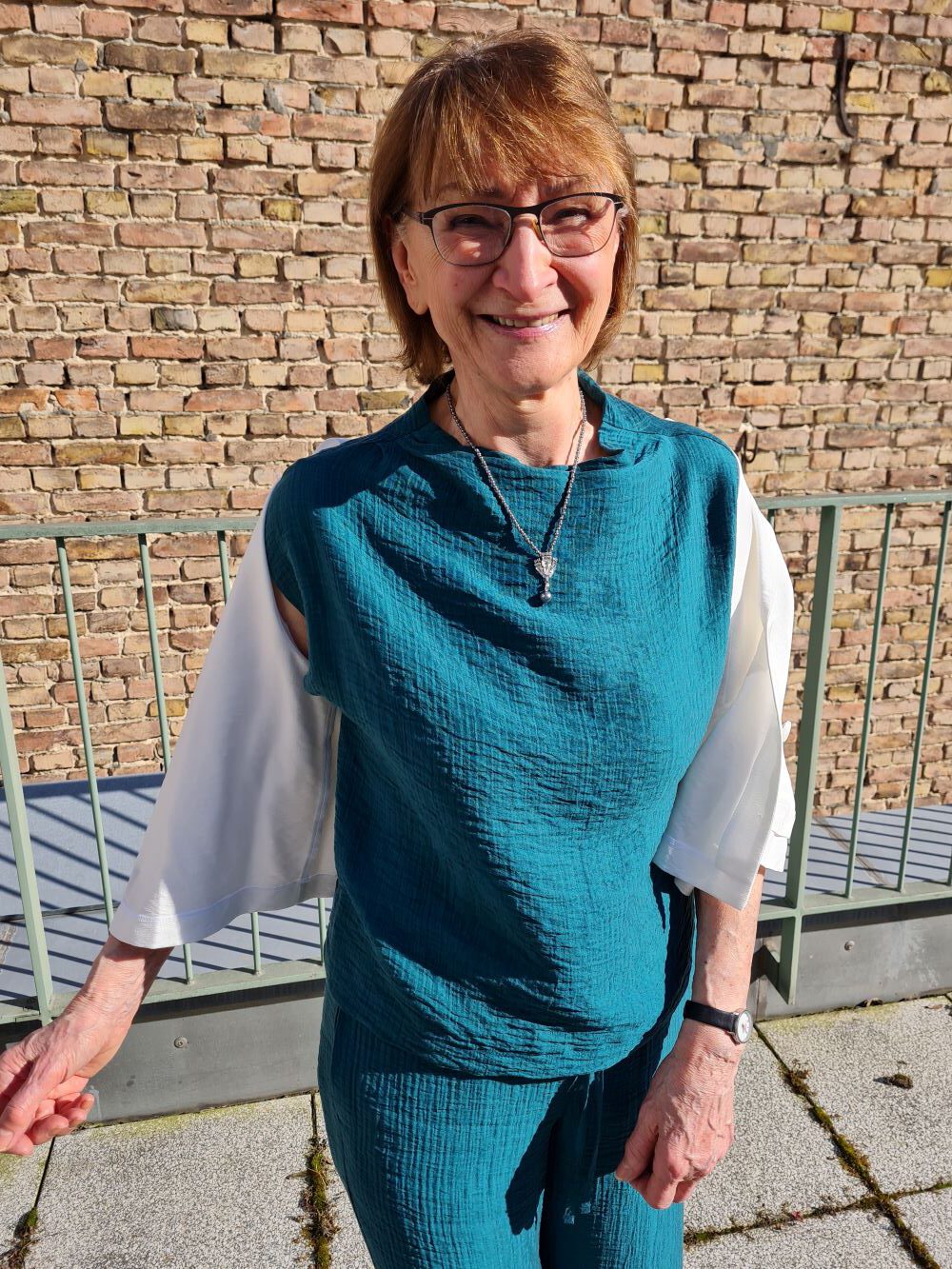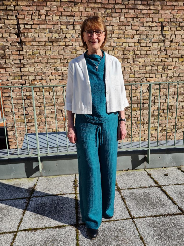 Look des Tages – aus Anlass des Frauentages heute ganz besonders chic: Sehen Sie ein Ensemble aus einer weiten, dünnen Hose mit Bindeband und einem dazu passenden Top mit Stehkragen und leicht überschnittenen Schultern. Der Stoff ist dezent in sich gemustert, die Farbe ist Flaschengrün und bringt die Augen unseres charmanten Gastmodels zum Leuchten. Sie trägt dazu eine kurze, sommerliche, weiße Jacke. Herzlichen Dank fürs Mitmachen :-). Übrigens gibt es diesen Zweiteiler nur bei uns oben, nicht im Online Shop.