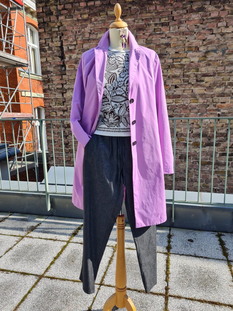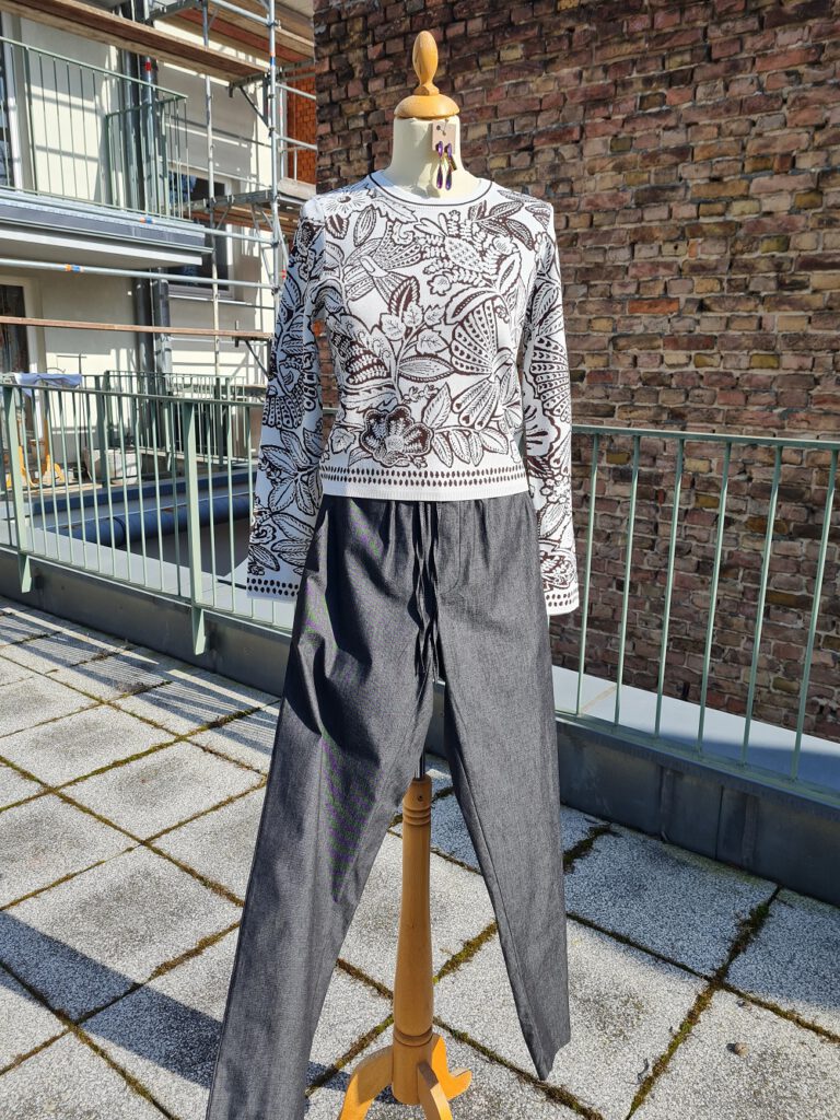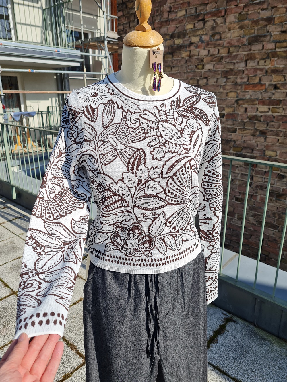 Look des Tages mit einer dünnen, sehr bequemen Sommerhose von unserem neuen italienischen Label Karma, aus 100% Baumwolle, in der Kombination mit unserem ausdrucksstarken Viskose-Feinstrick-Pullover mit einem braun-weißen, floralen Muster. Dazu gibt es den Frühlingsmantel von White Label.