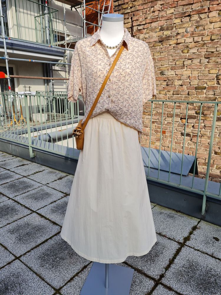 Look des Tages mit einer zarten Sommerbluse aus Spanien, kurzärmlig, dezent gemustert und klassisch geschnitten – die ersten beiden sind schon weg (obwohl es draußen noch so kalt ist!). Hier zeigen wir sie zu einem Baumwoll-Rock (Einzelstück, Größe M). Wir empfehlen dazu aber genauso gerne den ähnlichen Sommerrock von OUI. Sie finden alles bei uns oben oder die Bluse und den OUI-Rock im Onlineshop.