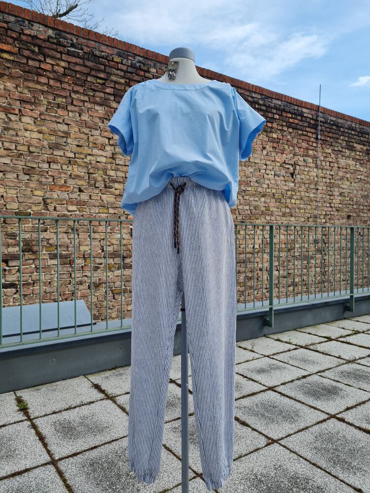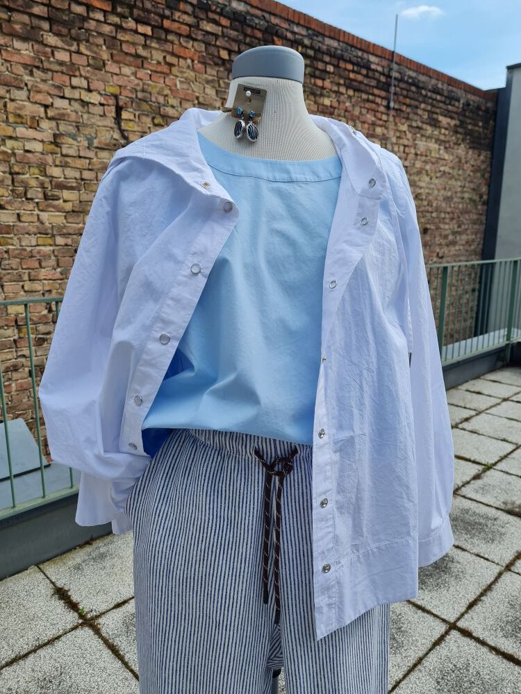 Look des Tages: Sehen Sie bei den heutigen angenehmen Temperaturen ein sommerliches Outfit mit der bequemen, gestreiften Jogpant von 10Days, einer leichten, kurzen Bluse aus Baumwolle in Hellblau und dazu die dünne Kapuzenjacke von Eve in Paradise. Diese drei Teile lassen sich vielseitig einsetzen und bringen Sie weit über den Sommer!